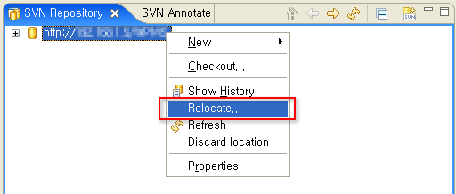 리파지토리에 마우스 우클릭하여 Relocate 를 하면, 해당 리파지토리에서 체크아웃받은 모든 프로젝트의 주소가 변경된다.